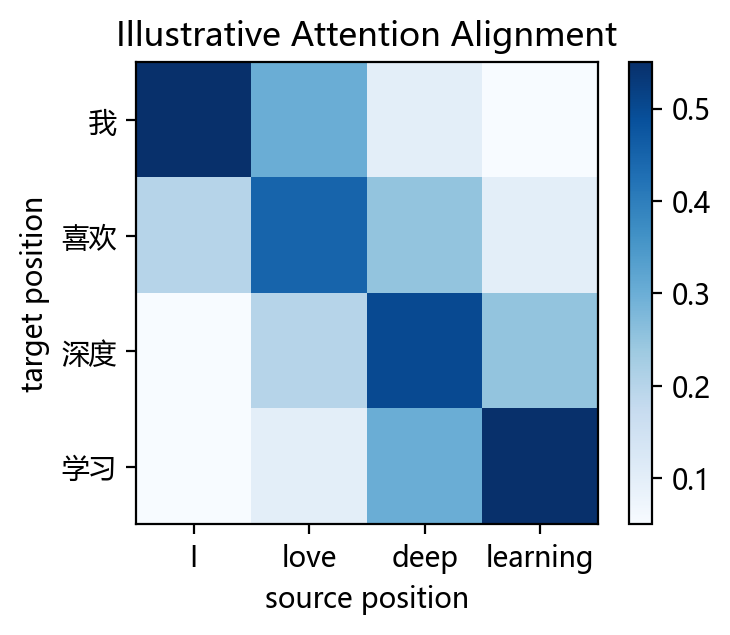 上面这个矩阵只是 attention alignment 的一个示例。它想表达的是:在生成不同目标词时,模型会对源句中不同位置分配不同的权重。真实训练得到的 attention 往往不会这么整齐,也不一定是一一对应的。